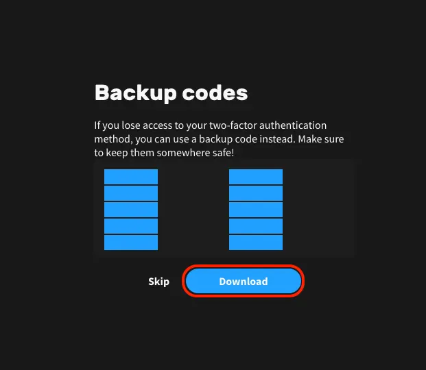 (可选)除了配置基于 TOTP 的身份验证器应用程序外,我们还将提供 10 个备份代码,可用于代替 6 位 TOTP 代码。这些代码仅在您无权访问身份验证器应用程序的情况下使用。下载代码并确保它们保存在安全的地方!