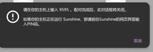 单击未配对的主机图标,会弹出如图所示的对话框,不要取消这个对话框,立刻将PIN码发送给sunshine主机的用户,让他进入sunshine 管理网站的PIN页面输入这个PIN码进行配对