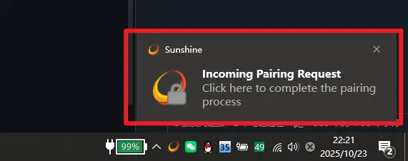当moonlight发送配对请求时,sunshine主机会在右下角弹出如下图所示的系统通知,点击他打开sunshine管理网站的PIN页面。
