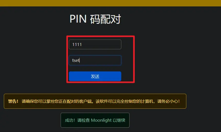 在PIN页面输入moonlight客户端发送的PIN码,设备名称随便填,点击发送即可.配对成功