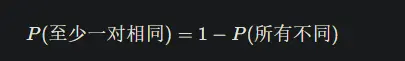 至少两人生日相同的概率 P(至少一对相同)P(至少一对相同) 为: