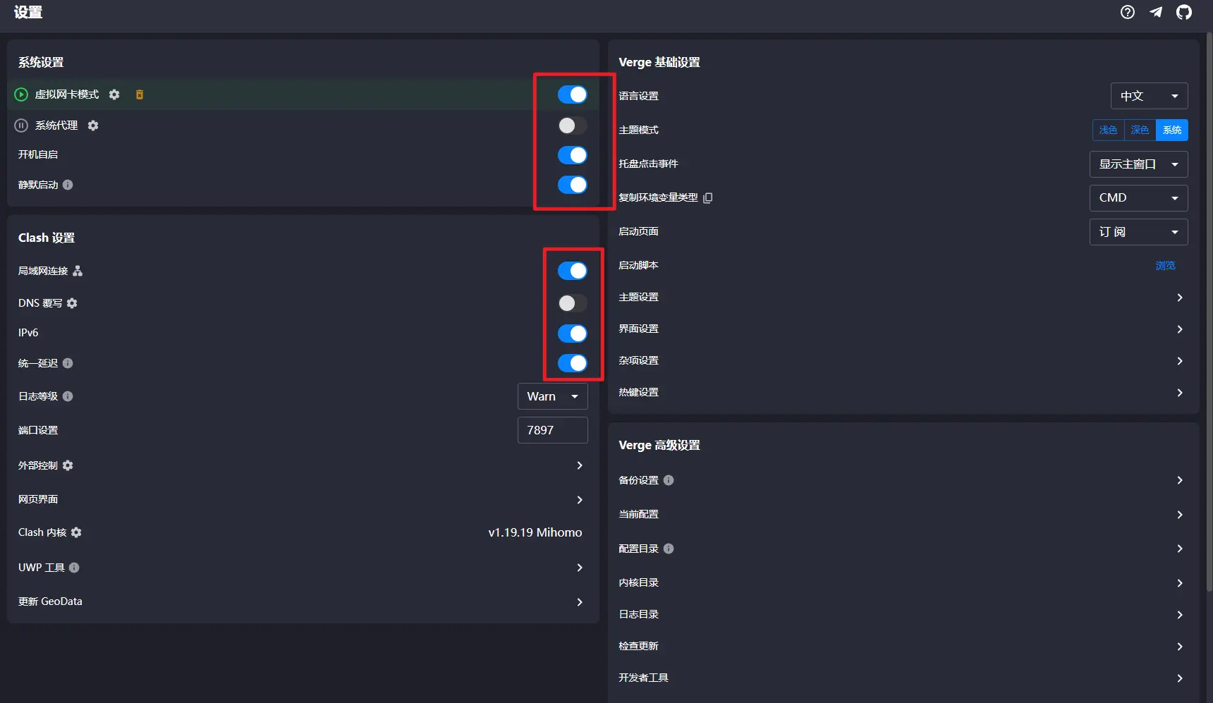 第四步, 在软件的设置中,如图所示打开红框中的配置后,只要导入的订阅可用,就可以正常访问外网了。
