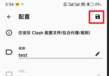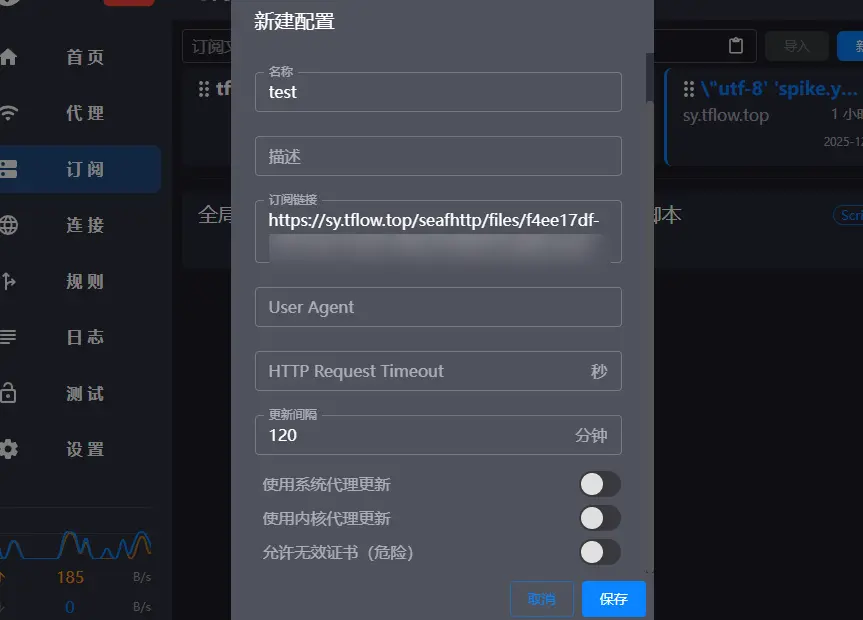 第二步,名称可自定义,URL填刚刚复制的魔法配置链接,自动更新填120分钟,然后点击右上角的保存,如图所示