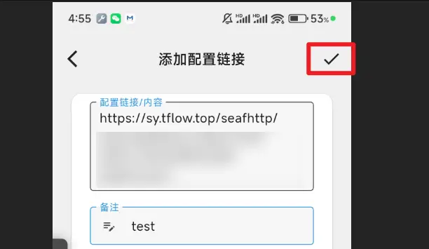 第二步,在添加配置链接页面将刚刚复制的魔法配置链接粘贴到配置链接/内容中,备注随便写,点击右上角的√保存。