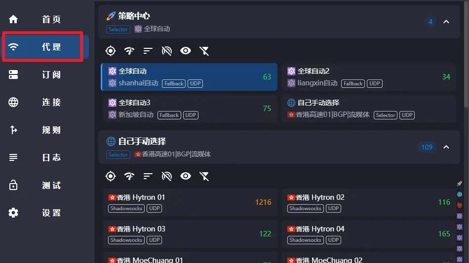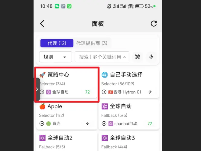 软件首页点进面板 页面后,如下图所示,每一个选项卡是一个 策略组,点击对应策略组可查看详细内容 。 我们只需掌握策略中心和自己手动选择 这两个策略组的用途,下面介绍3个使用情况来轻松掌握。