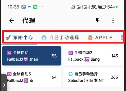 如下图所示,软件首页点进代理 页面后的顶行就是各个策略组,点击对应策略组可查看详细内容 。 我们只需掌握策略中心和自己手动选择 这两个策略组的用途,下面介绍3个使用情况来轻松掌握。