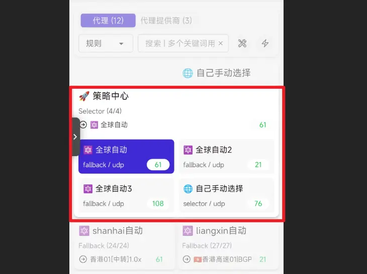 策略中心策略组使用全球自动策略但仍然感觉网络不好用时,就得在策略中心策略组中尝试其他序号的全球自动策略 - 当任何