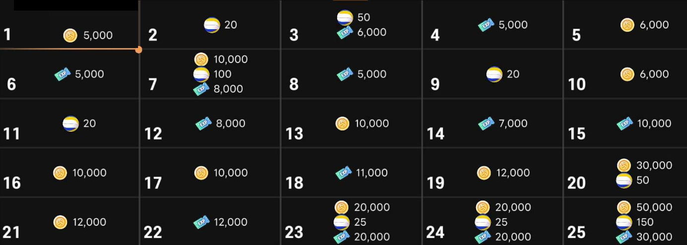 本文章永久分享链接: https://tflow.top/TheSpike/SignOn 位于游戏首页右侧,签到图标如右图所示: 单月全勤最高可获得 20.1万 球芒币,14.7万经验值,460个排球。如图所示: