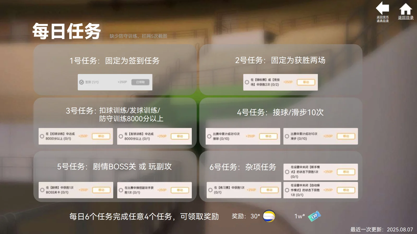 每日6个任务完成任意4个任务,可领取奖励:30个排球,1万经验值