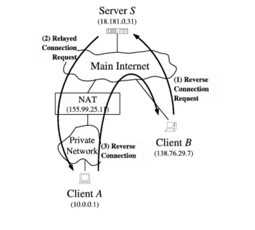 - 通过公网服务器协调:节点A和节点B都连接到同一个公网服务器S。