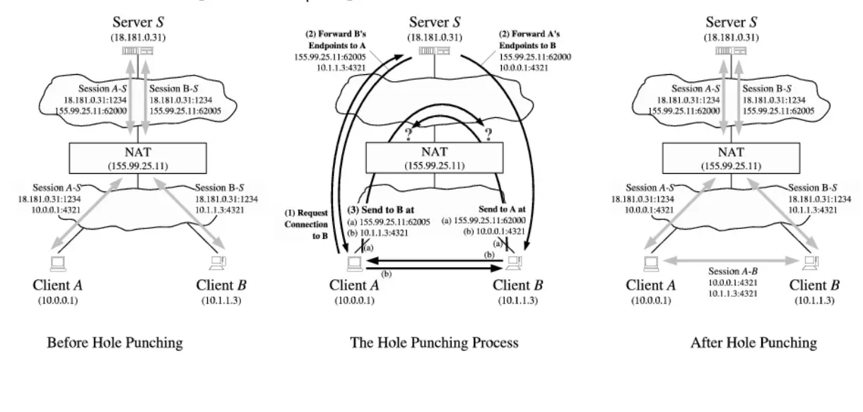 对于对称NAT,唯一的方法就是让A向B发送打洞包,并使用这个新创建的、专门用于与B通信的映射来建立连接。信息交换和连接流程不变,但开发者需要理解其端口的动态性。这在后面的场景也会再次提到。