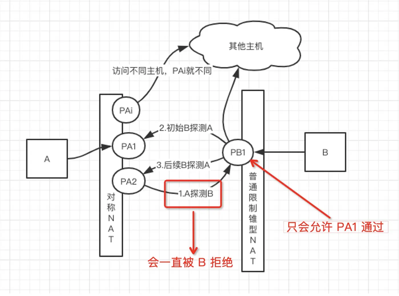 原本大致过程是同上面一种场景,但是由于 B 是端口限制型 NAT,会导致 PB1 只允许 PA1 通过(上面红色字体部分B 已经为 A 在 PB1 打好洞),从而 PA2 过来的包会被 B 的 NAT 拒绝,导致打洞失败。