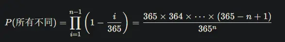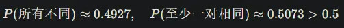 至少两人生日相同的概率 P(至少一对相同)P(至少一对相同) 为: