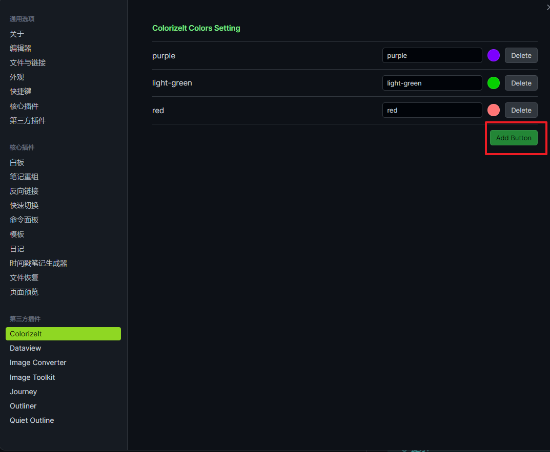 在左下角的设置中找到 colorizelt 后,在颜色设置中点击 add button 来添加自己喜欢的颜色样式,并在文本框中设置好颜色的名称。